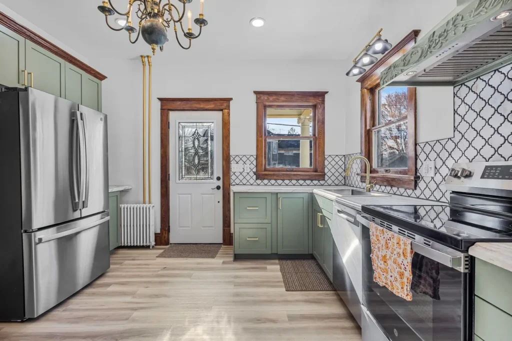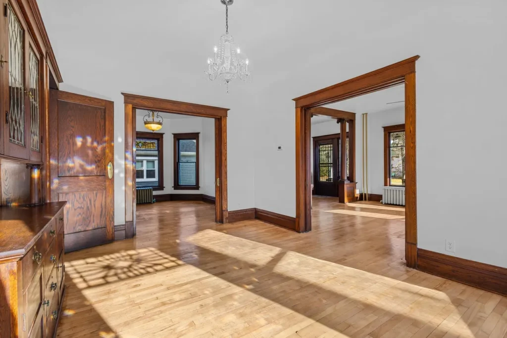 The interior shines with freshly painted walls, original woodwork, built-ins, solid wood doors, and elegant vintage chandeliers.