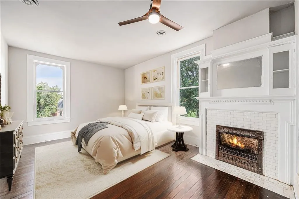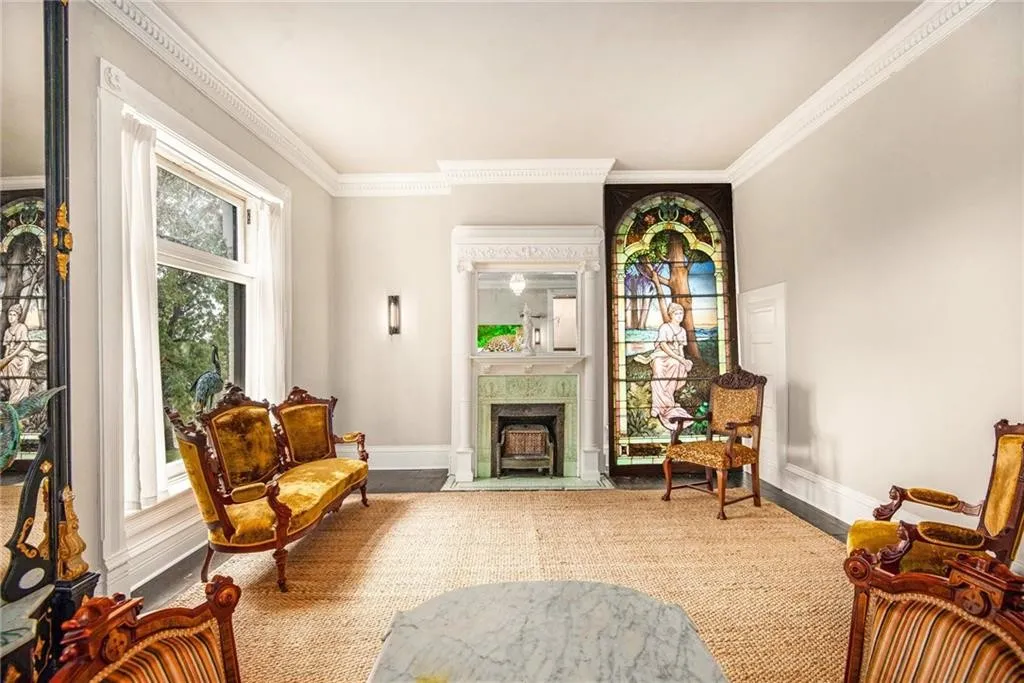 Inside, the home showcases eight spacious bedrooms, including four with their own original fireplaces, and a private balcony off the primary suite—a perfect retreat overlooking the surrounding historic neighborhood.