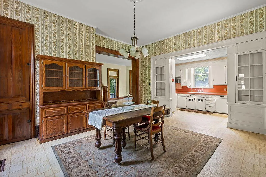 The interior retains the material weight of its era. Original wood trim and baseboards anchor rooms organized around two preserved decorative fireplaces. The formal dining room features original built-in cabinetry, maintaining the historic separation of domestic and service spaces. While the layout contains five second-floor bedrooms and practical modernizations like first-floor laundry and an attached two-car garage, this is an honest, “as-is” estate. The significant deferred maintenance represents an authentic, rigorous restoration project for a steward ready to stabilize and revive a historic envelope.