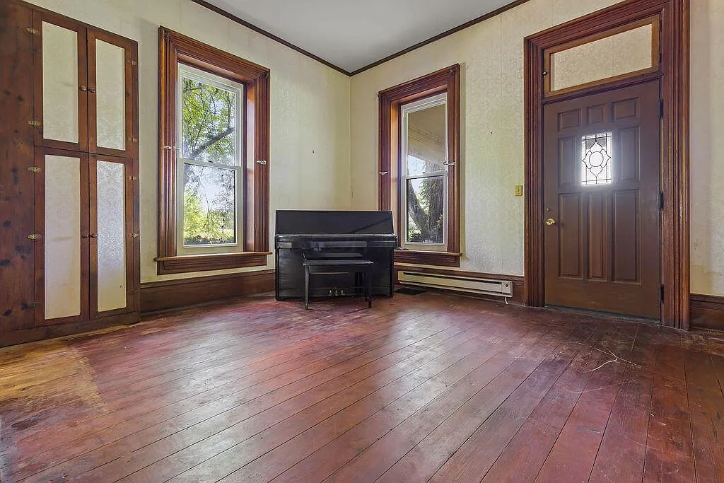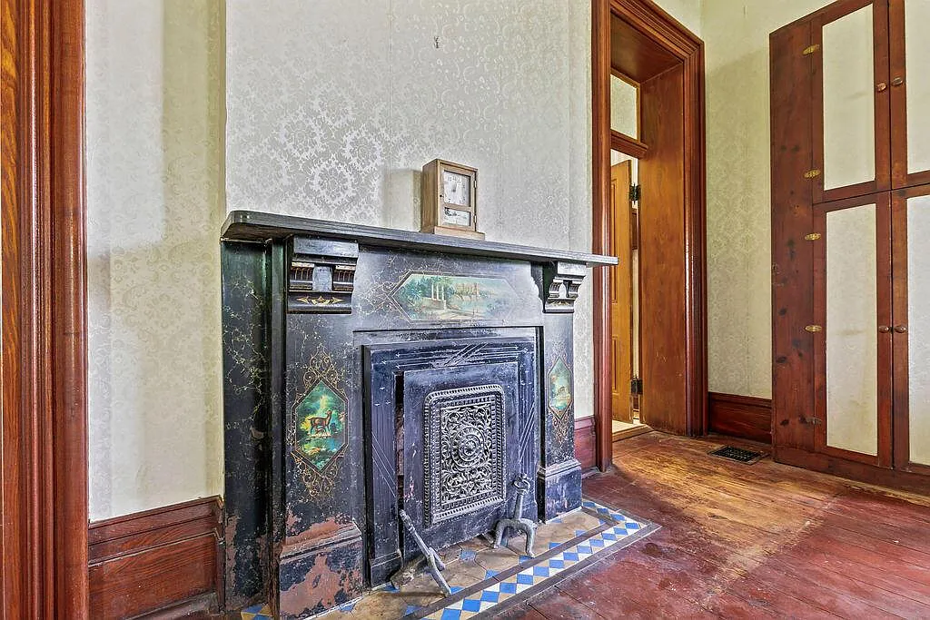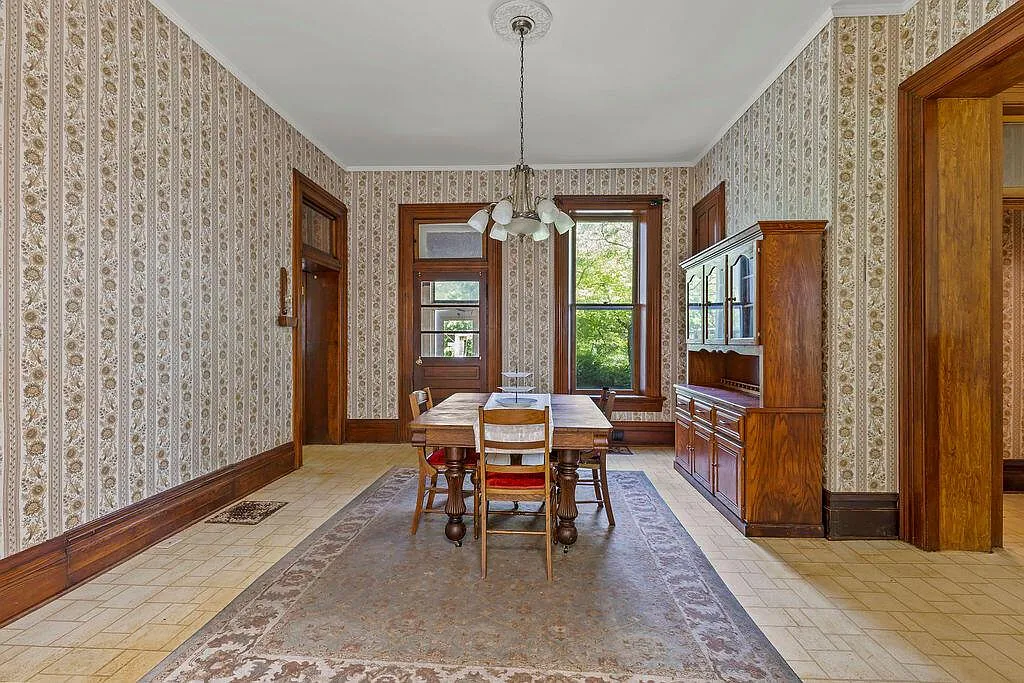 The interior retains the material weight of its era. Original wood trim and baseboards anchor rooms organized around two preserved decorative fireplaces. The formal dining room features original built-in cabinetry, maintaining the historic separation of domestic and service spaces. While the layout contains five second-floor bedrooms and practical modernizations like first-floor laundry and an attached two-car garage, this is an honest, “as-is” estate. The significant deferred maintenance represents an authentic, rigorous restoration project for a steward ready to stabilize and revive a historic envelope.