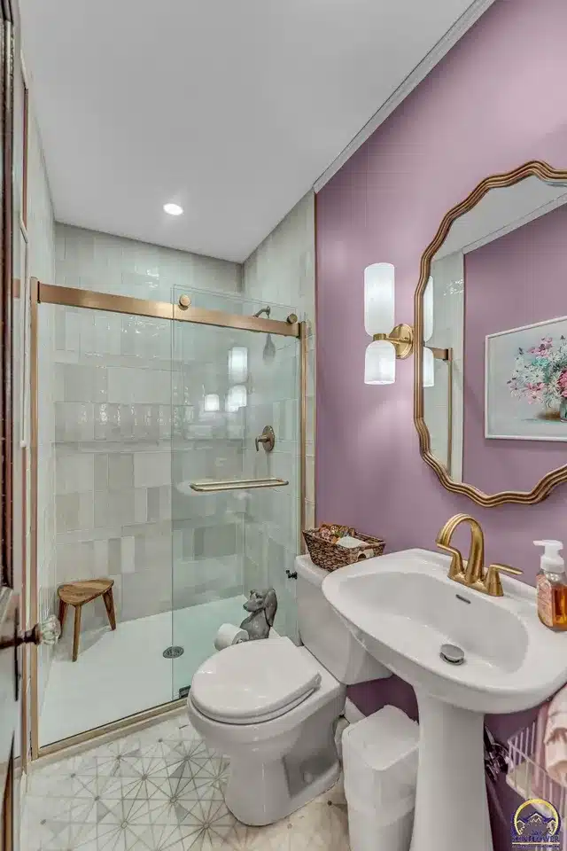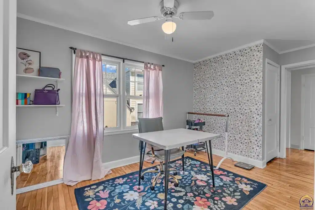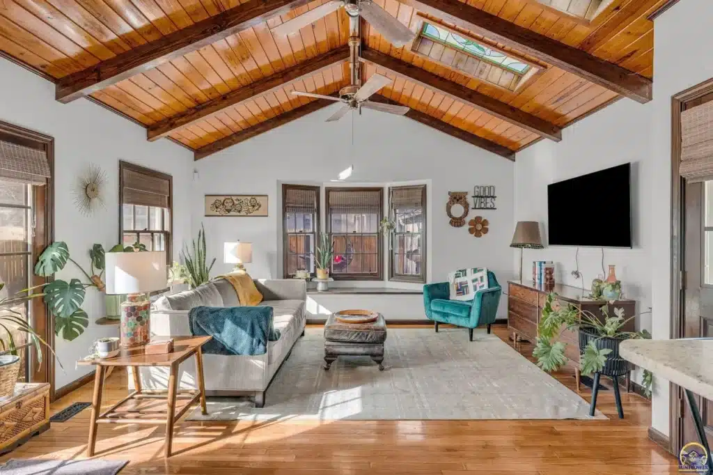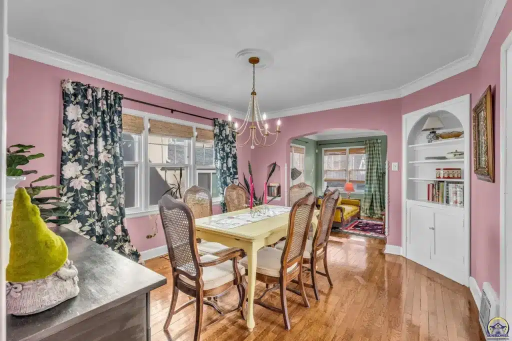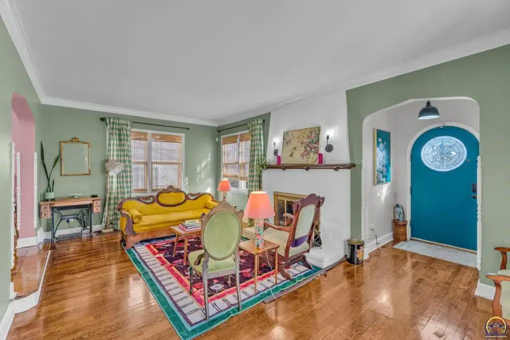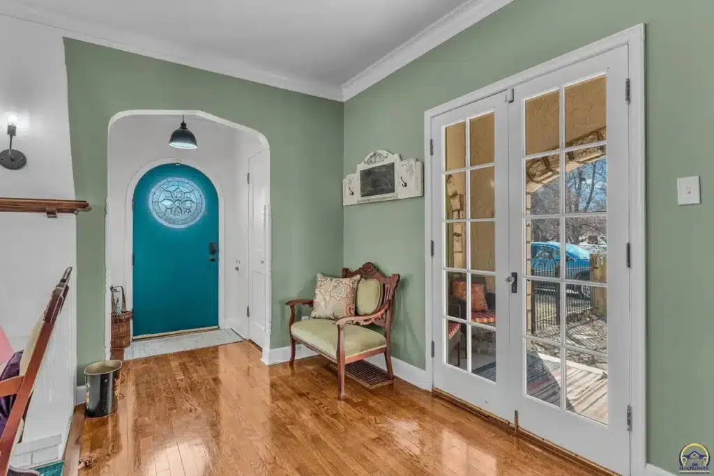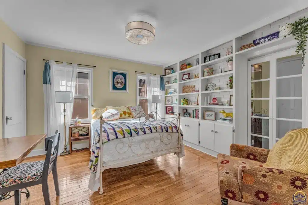 The exterior living spaces are discreetly integrated, including a covered side porch accessed via French doors, offering privacy not visible from the streetscape. Located just two blocks from Collins Park, this home represents a preserved fragment of Topeka’s early 20th-century development.