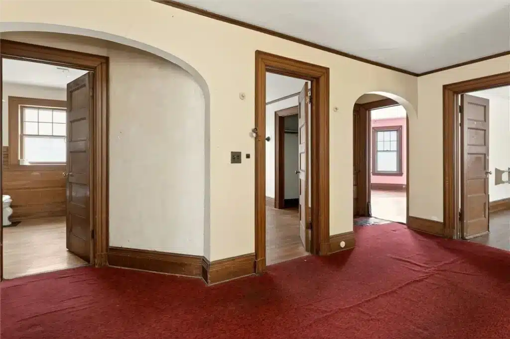 A prominent staircase, illuminated by a large original stained-glass window, leads to the second floor. Here, arched doorways and built-ins define a generous central foyer. Depending on configuration, this level accommodates four to five bedrooms, all with closets—an uncommon feature in houses of this age. One room, currently arranged as a living space, includes a decorative fireplace and small kitchenette, hinting at the home’s long history of evolving use. A second full bath with a clawfoot tub serves this floor.