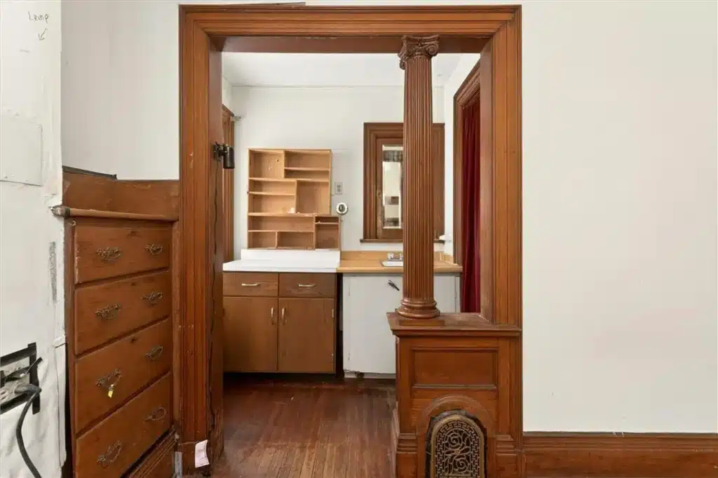 Inside, the foyer immediately establishes the home’s character, with intact natural woodwork and a built-in bench that reflects everyday Victorian practicality. A large original pocket door opens into the living room, where built-ins and a wood-burning stove insert anchor the space without overpowering it. Throughout the first floor, multiple rooms—many separated by original pocket doors—create a layout that can shift with changing needs. These are true rooms, not leftover spaces, and they lend themselves equally well to offices, guest rooms, studios, or sitting rooms.