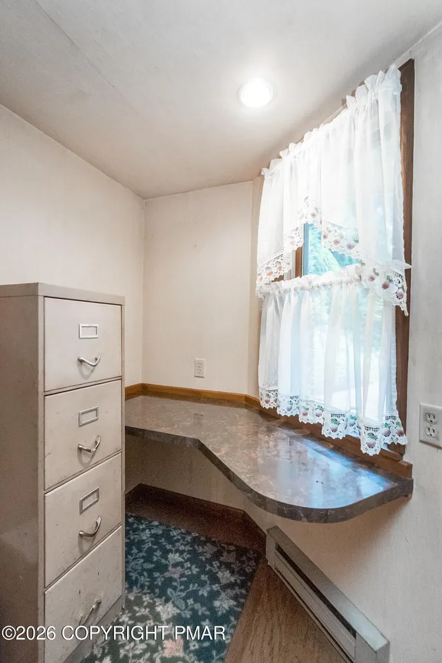 The home offers one full bath and one half bath, both tastefully renovated, along with a separate room featuring original built-in wood cabinetry for extra storage.