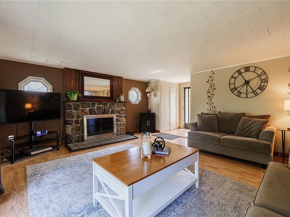 Step inside to an inviting kitchen and dining area with a soaring cathedral ceiling and floor-to-ceiling windows that fill the space with natural light, creating an open and airy atmosphere. The living room features a stunning stone fireplace, the heart of the home—perfect for cozy evenings and warm gatherings. The loft space adds flexibility, ideal for a guest room, home office, play area, or reading nook.