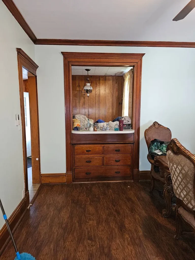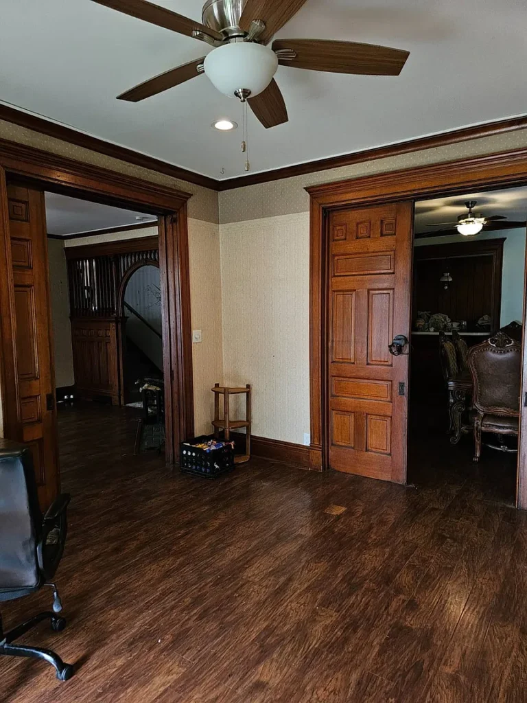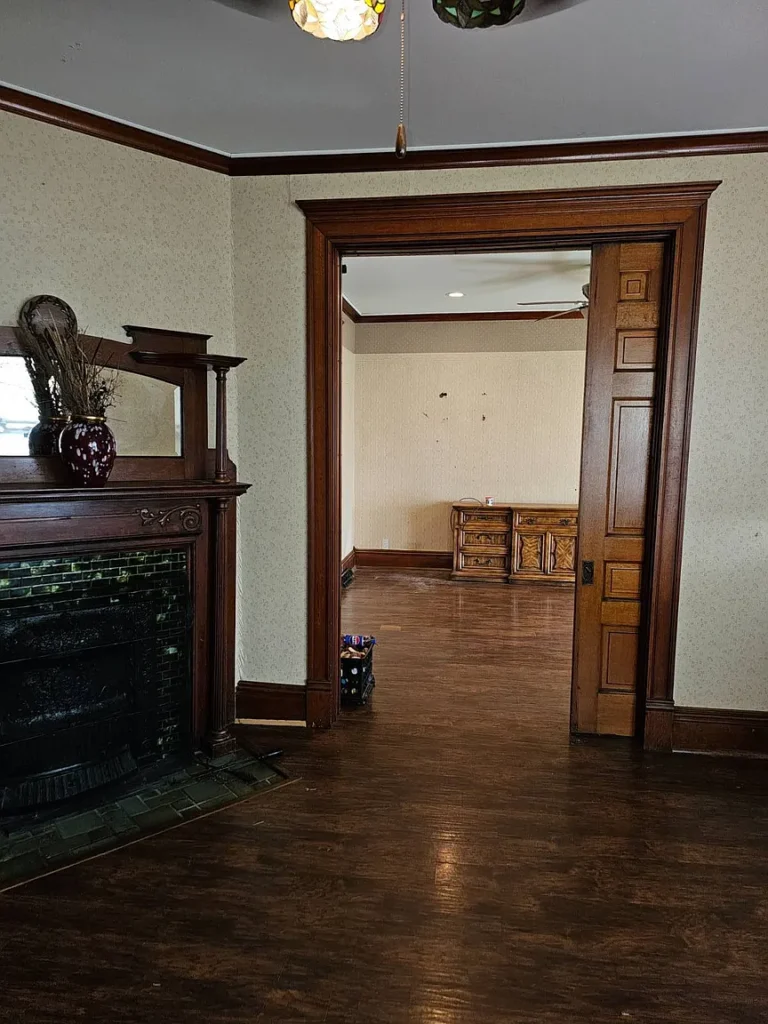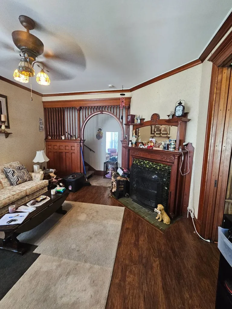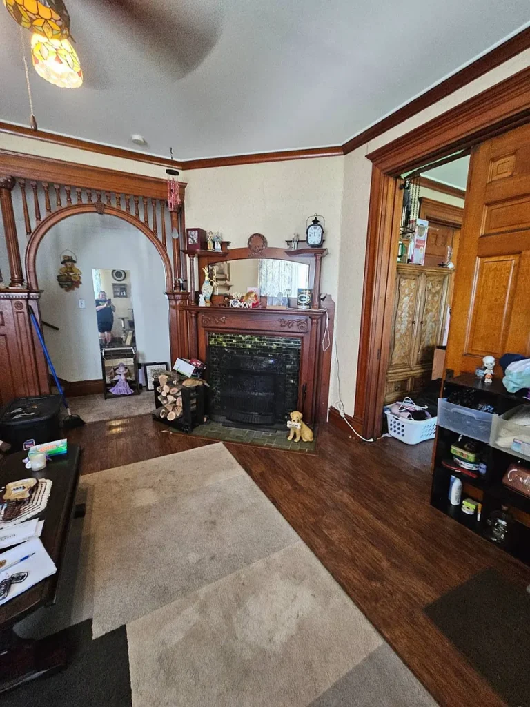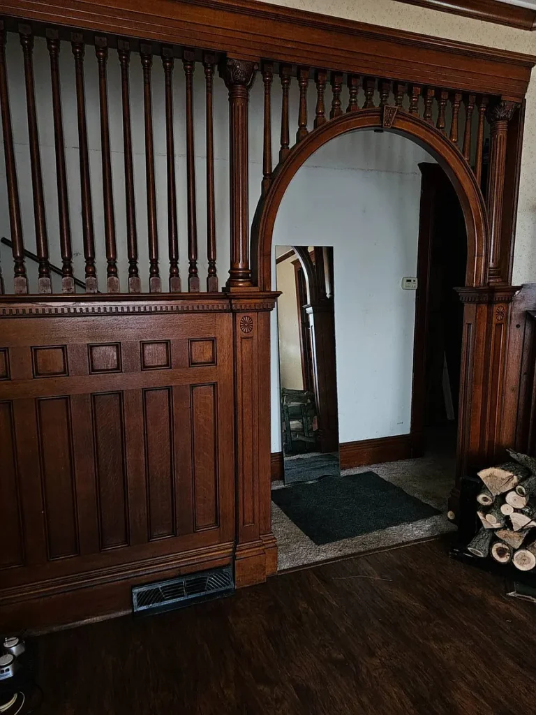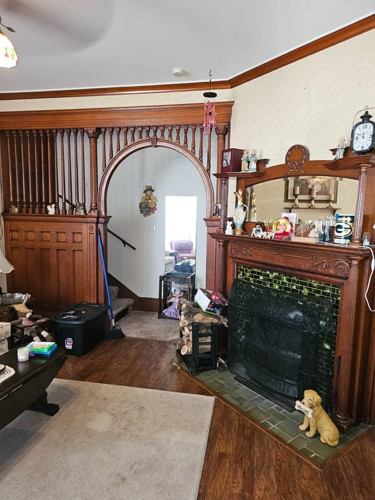 This turn-of-the-century residence stands as a testament to the transition between Victorian ornamentation and 20th-century solidity. The interior is defined immediately by its joinery: a stunning arched entry frames the main staircase, a specific architectural flourish that sets the tone for the rest of the home. The front parlor retains its original unpainted woodwork and is anchored by an ornate, carved wood-mantled fireplace—the undisputed focal point of the living volume.
