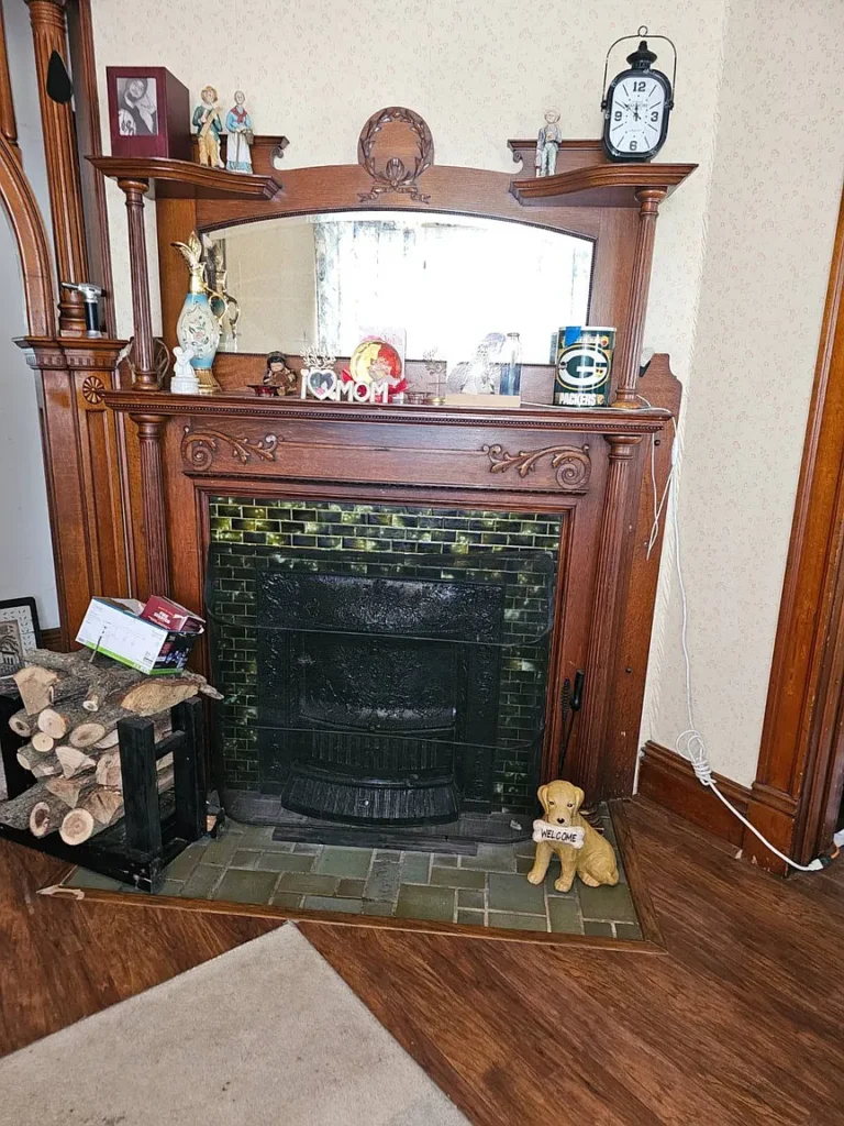 🔥 Ornate carved wood mantel with wood-burning fireplace