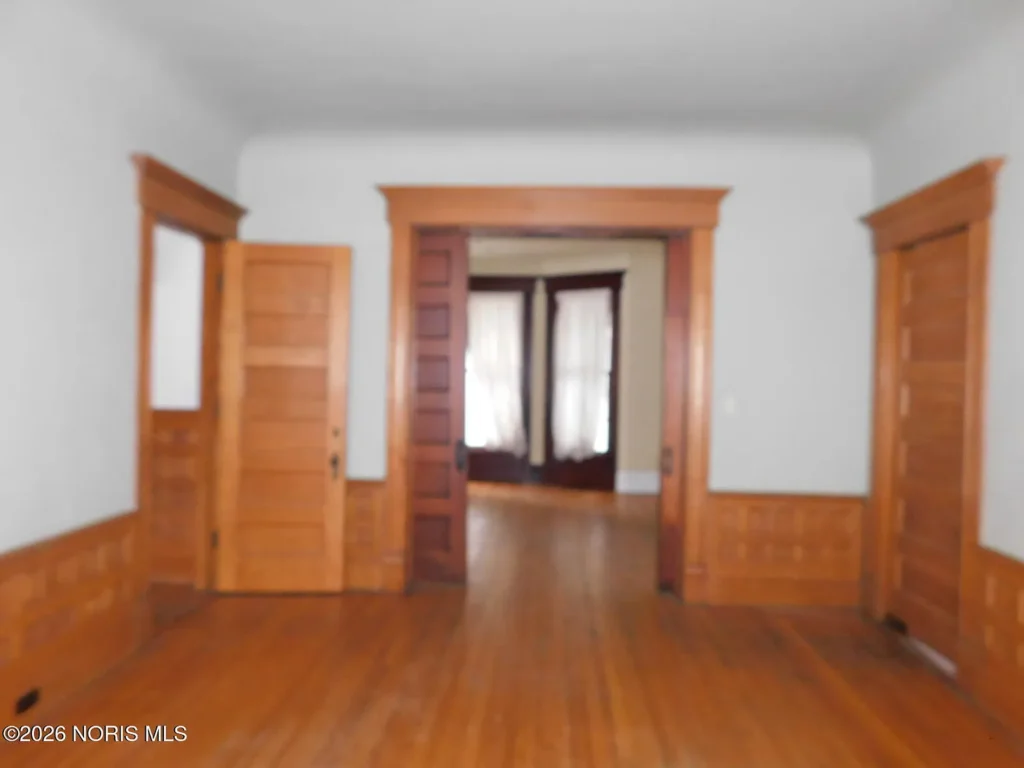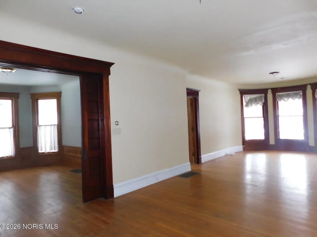 The interior is a study in unpainted natural wood—a feature often lost to generations of white paint. The foyer and formal rooms are anchored by original hardwood flooring and heavy casing profiles. Crucially, the home retains its original pocket doors, essential for preserving the intended “circular floor plan,” a layout designed for the social circulation of the turn of the century rather than the static boxiness of later builds.