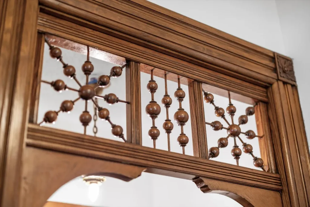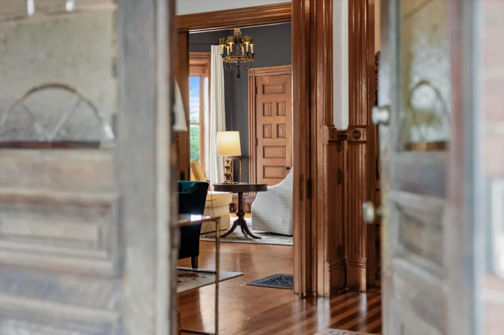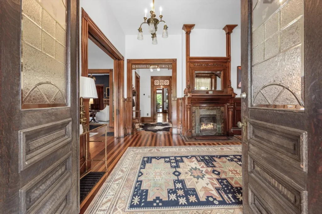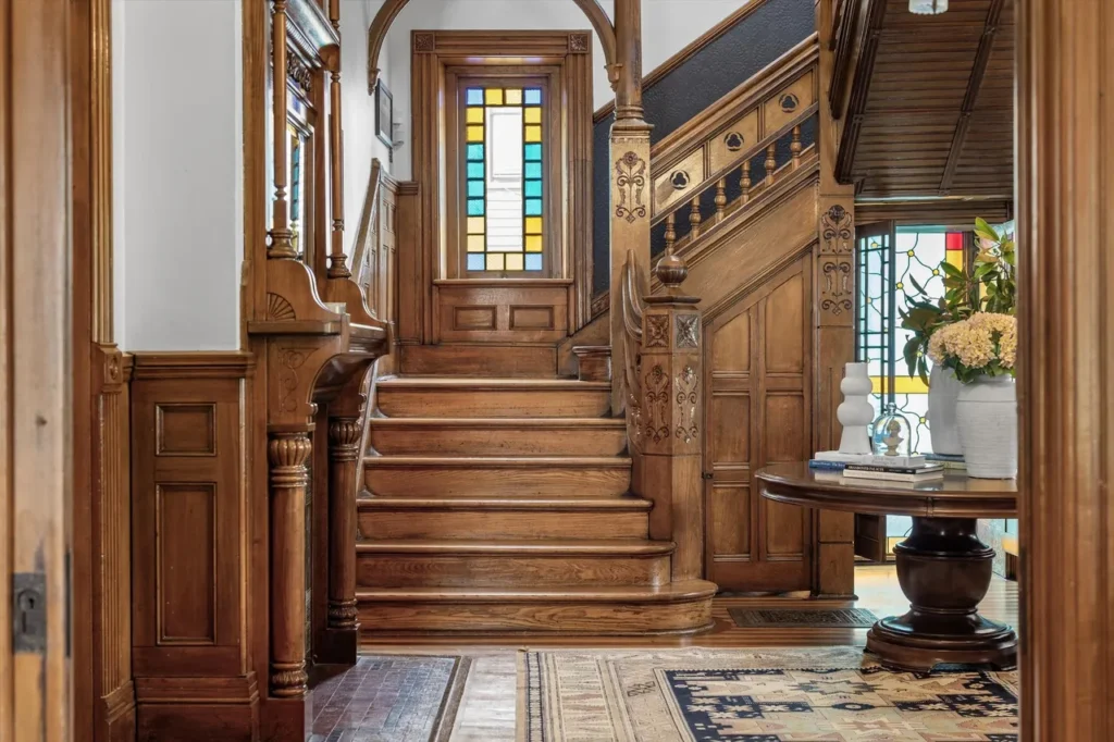 Step through the etched-glass double doors into a grand foyer that serves as a masterclass in 19th-century timber. The interior showcases six distinct wood species, meticulously preserved to highlight the wealth and craftsmanship of the era.