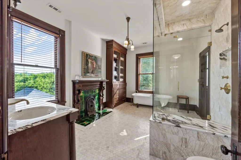The Windows: The home is illuminated by nine original stained-glass windows and anchored by five ornamental fireplaces, each with unique period mantels.