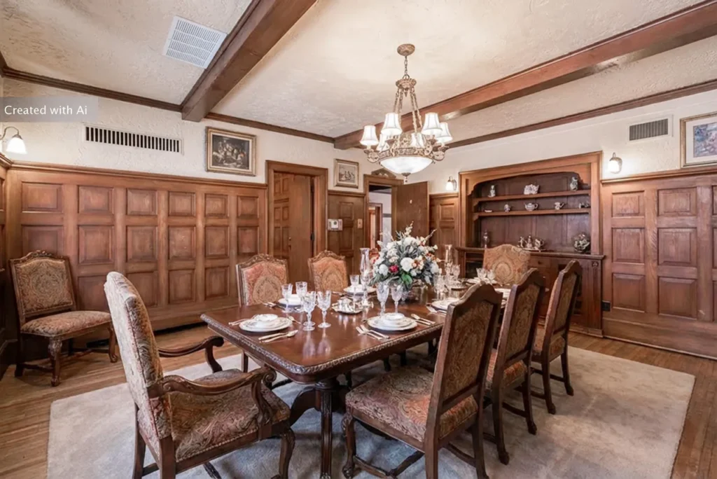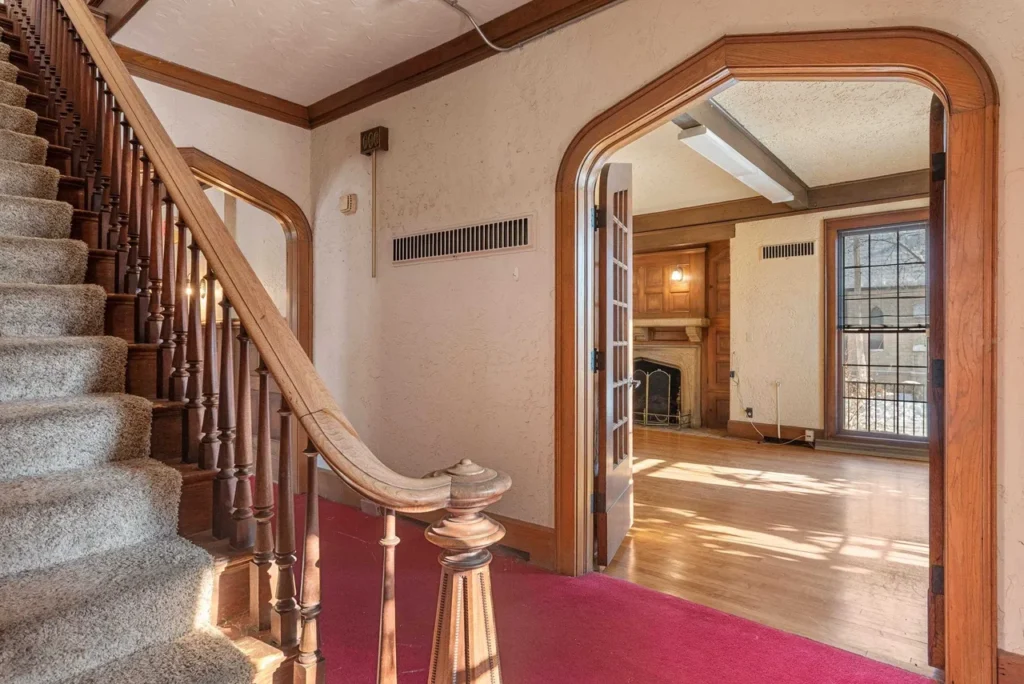 The interior features a dramatic oak staircase, extensive wood paneling, tall ceilings, and exquisite period millwork.