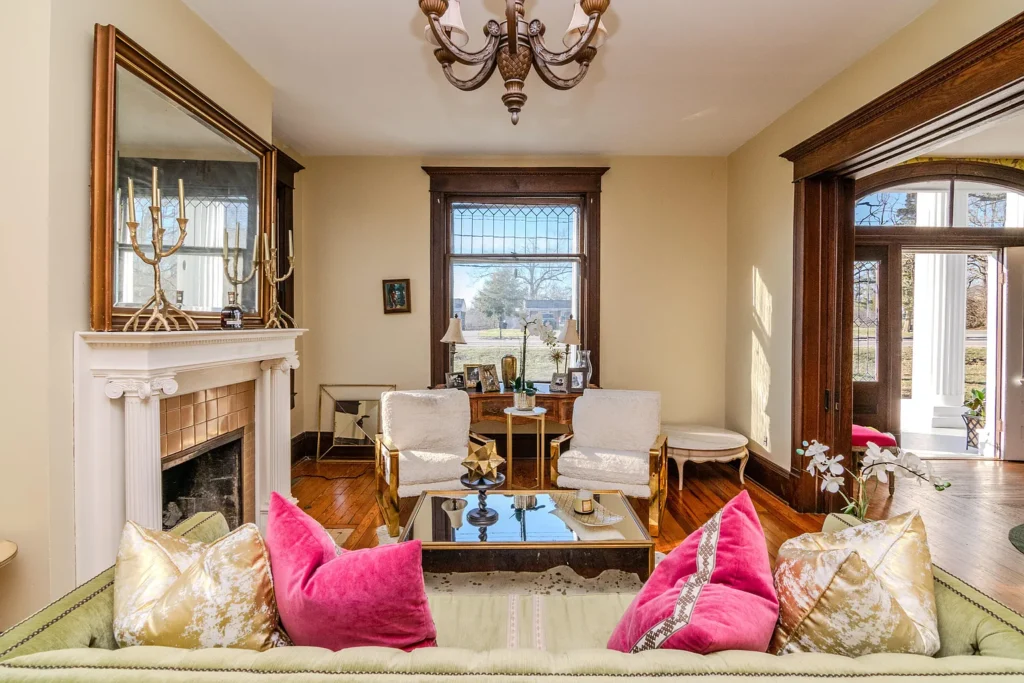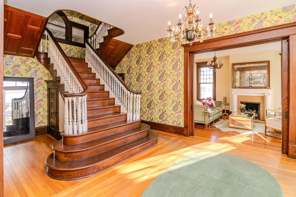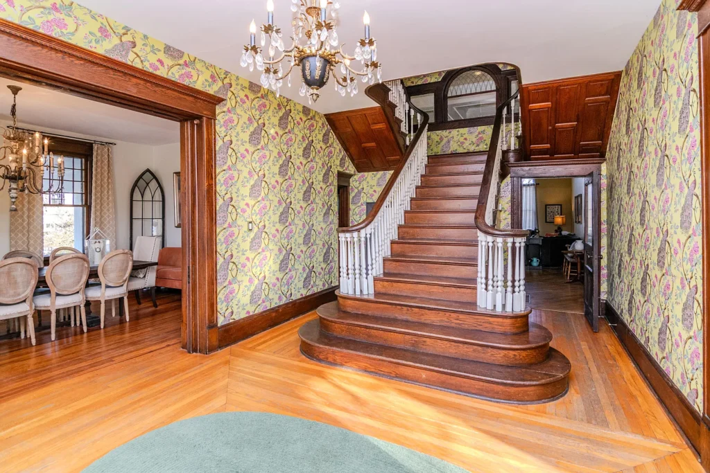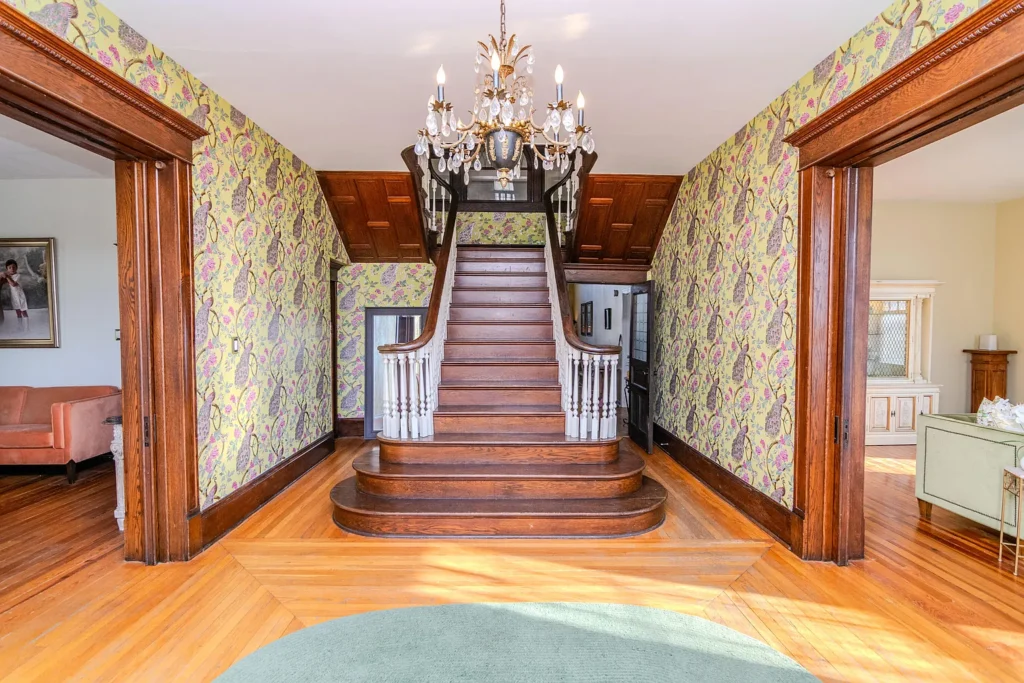 A breathtaking foyer welcomes you with a sweeping staircase and exquisite architectural details ✨, while the formal living room showcases intricate moldings and sun-filled windows 🌞.