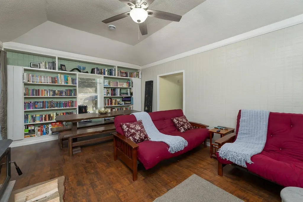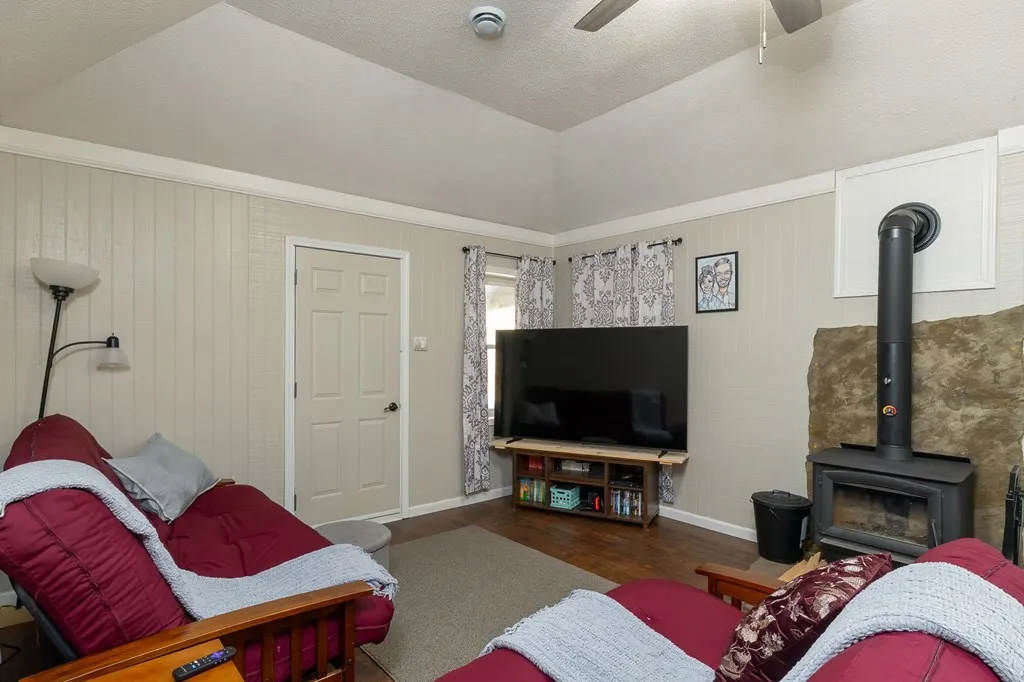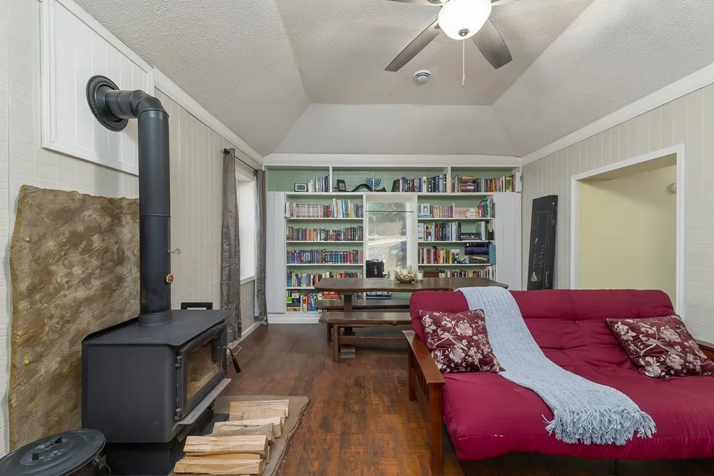 🔥 Spacious living room with wood stove & built-ins
