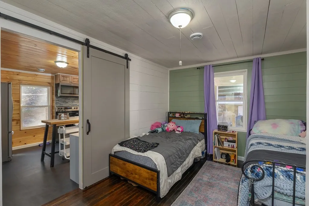 Mountain Character: A 2BR/1BA layout featuring a tongue-and-groove ceiling, entry foyer with storage, and a welcoming wood stove.