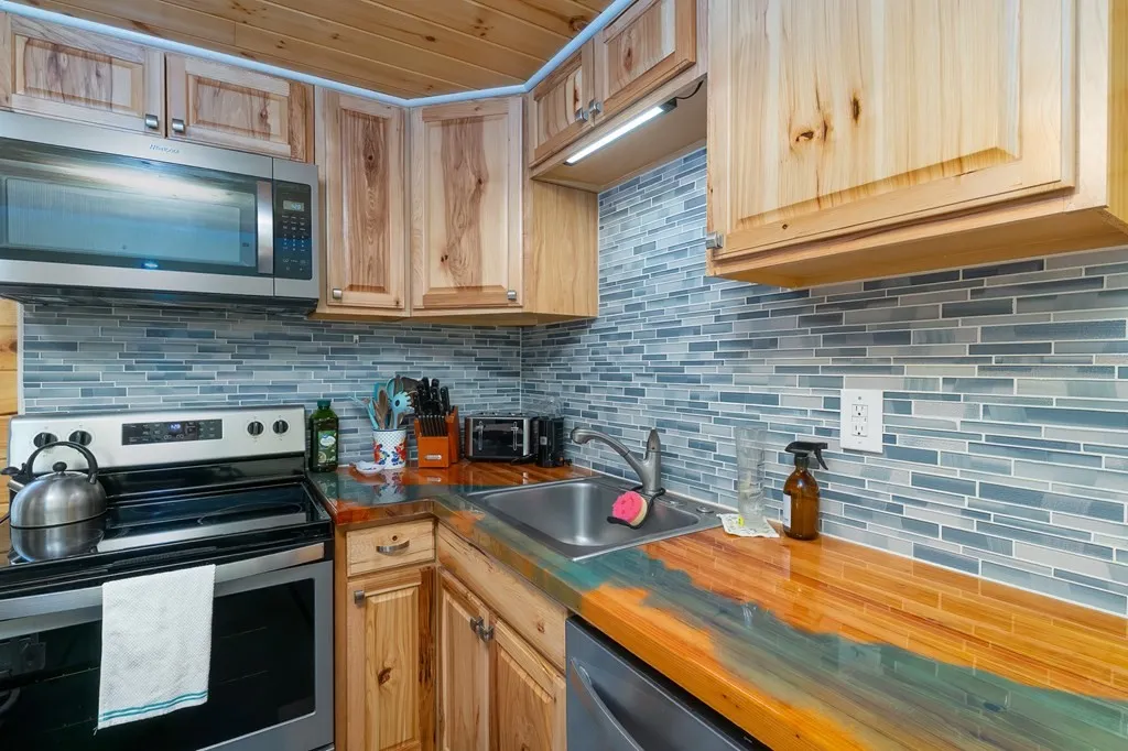 Historic Soul: Taken down to the studs and rebuilt, this 2BR/1BA cabin features kitchen counters crafted from salvaged oak from the original 1930s structure, preserving its story.